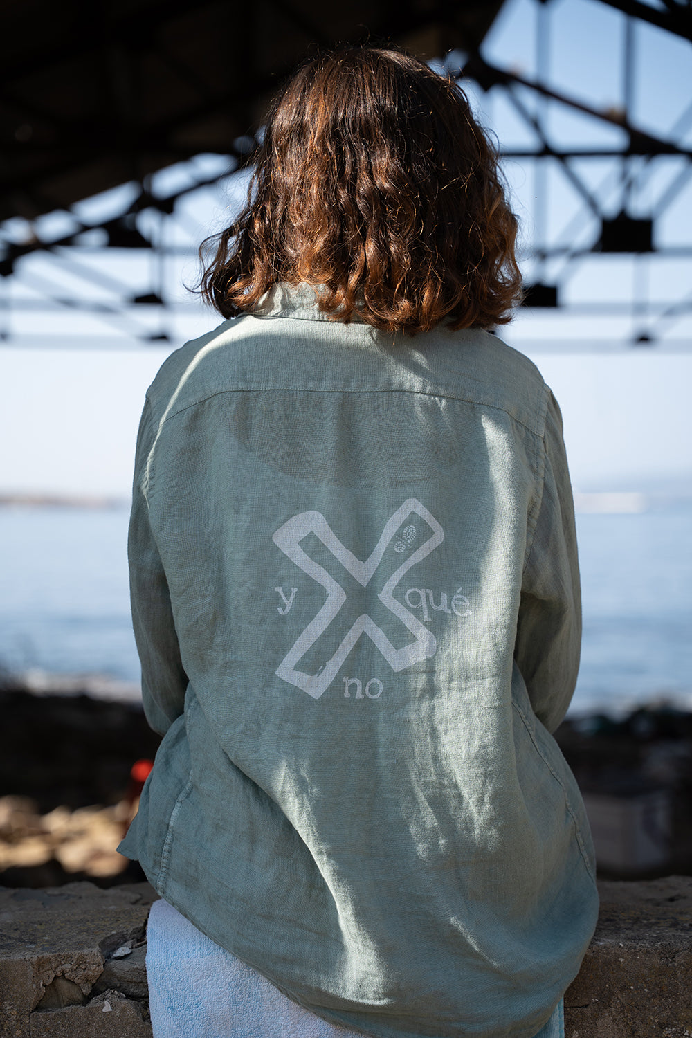 Camisa de lino Bohemius, diseñadas para quienes buscan frescura y estilo sin esfuerzo. 100% lino lavado, fit relajado de color verde con gráfico y x que no.