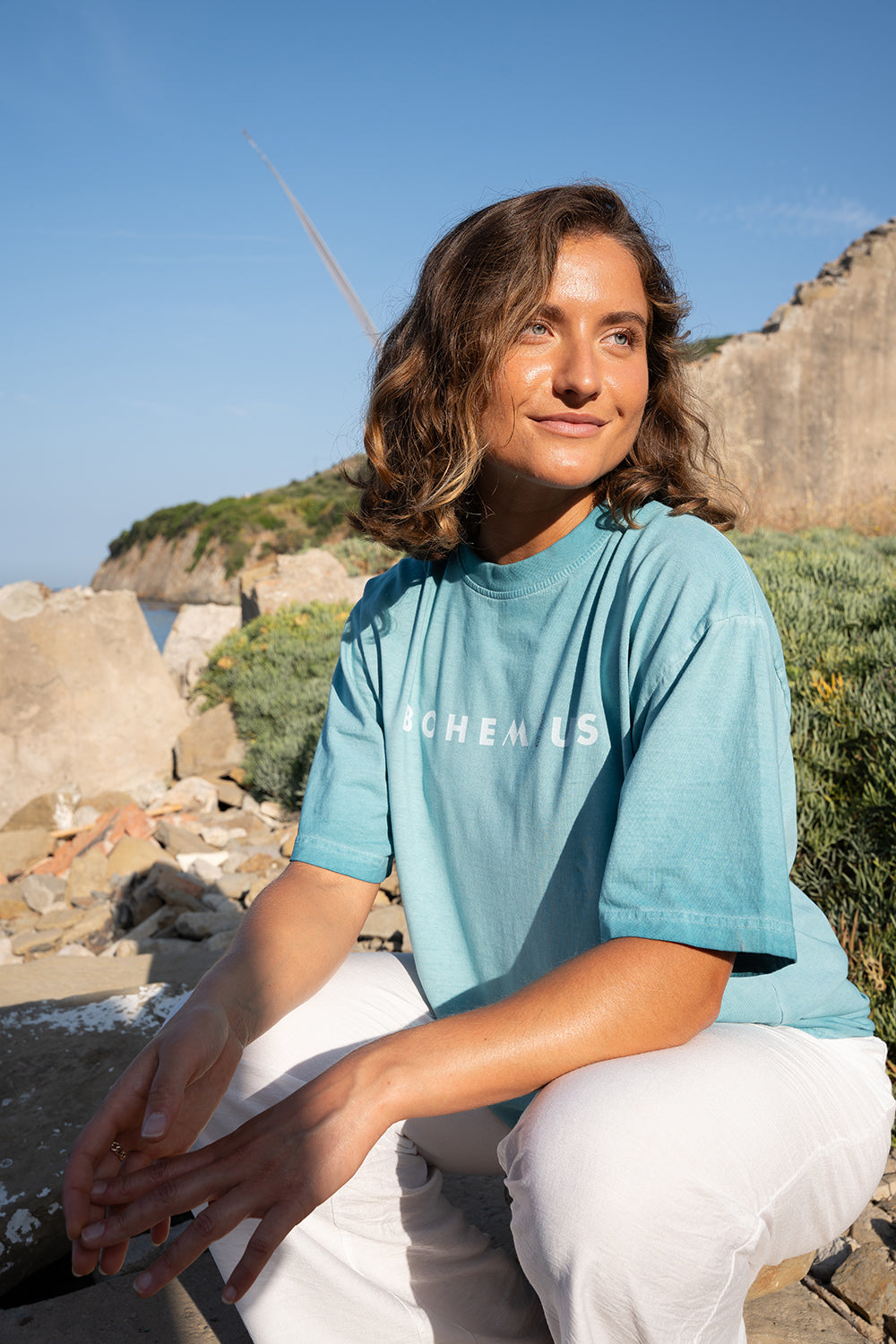 Camiseta 100% algodón, color agua marina lavado piedra.