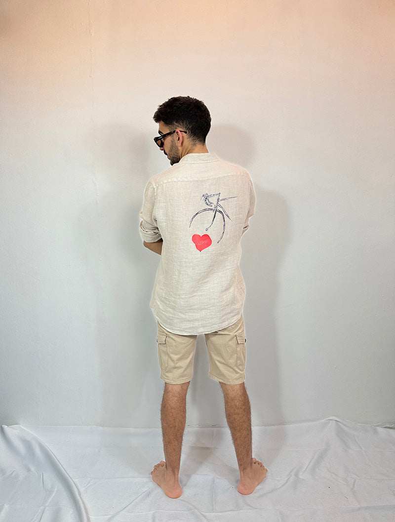 Camisa de lino Bohemius, diseñadas para quienes buscan frescura y estilo sin esfuerzo. 100% lino lavado, fit relajado de color arena con gráfico bici corazón.