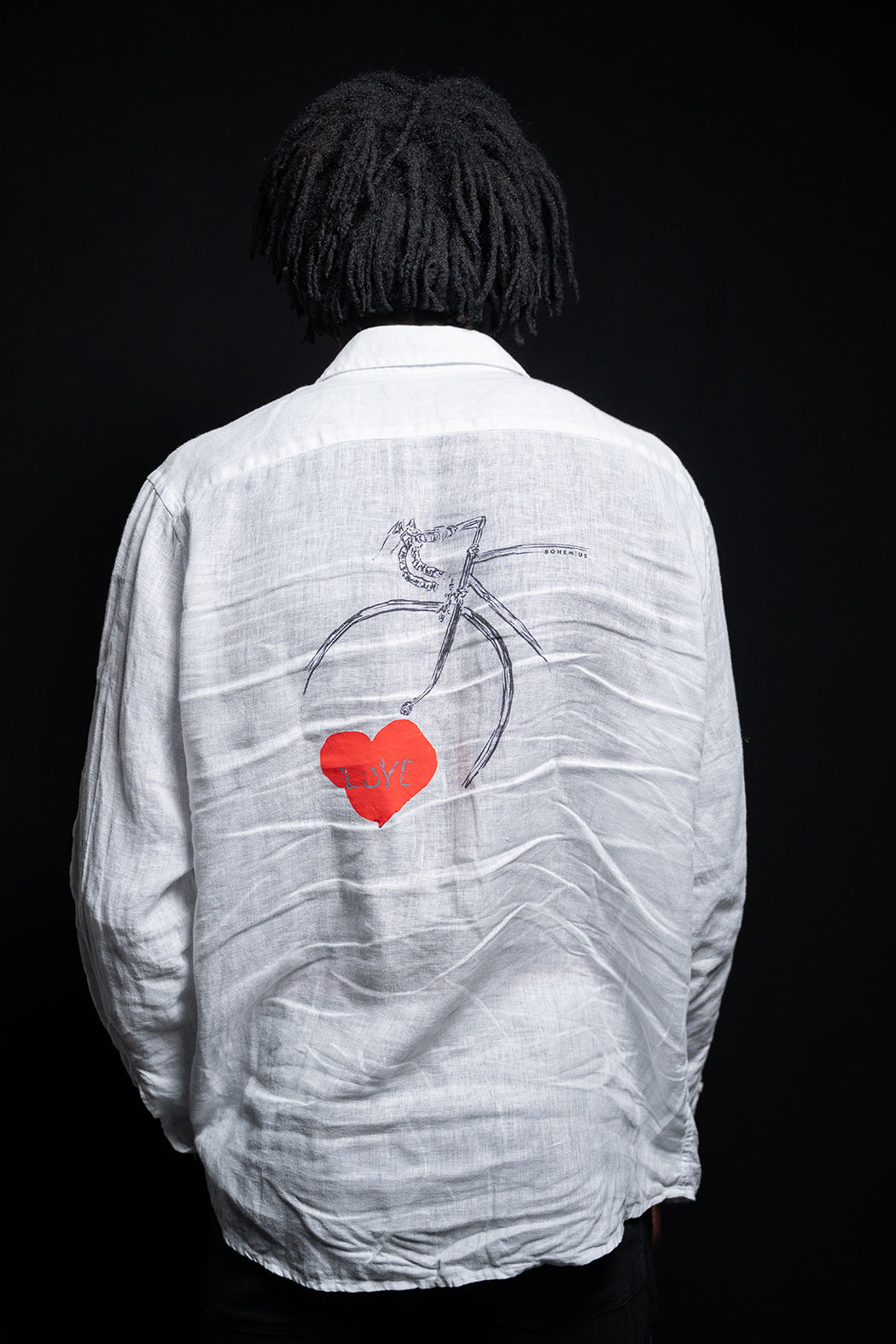 Camisa de lino Bohemius, diseñadas para quienes buscan frescura y estilo sin esfuerzo. 100% lino lavado, fit relajado de color blanca con gráfico bici corazón.